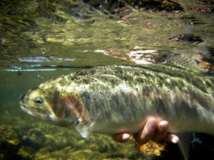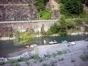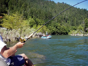 In August and September we offer 2 day Salmon/ Steelhead fishing trips for groups of 4 or more. The days are hot and the evenings are just right for camping on one of the many sandy bars down the lower Trinity. We take off in the morning aboard fully rigged 14 ft. inflatables, and fish our way down through some of the most pristine stretches of water the Trinity has to offer. We encounter occasional class 2-3 white water, (Just enough to cool us all down). Arriving at camp in late afternoon the group fishes, while the guides cook up one of the best riverside BBQ you have ever tasted. We sleep in tents or sleep under the stars whichever you prefer. We supply all the food and gear you will need except for your sleeping bag and fishing license. It is not uncommon to see deer, bear, coyote’s, eagles, otter, beaver and ospreys on these trips. After a light breakfast we head out and fish our way down river to where we have a nice river side lunch, arriving in the afternoon at our take out. This trip is full of fun and excitement and is a great experience for both kids and adults. We can handle groups from 4-10 people; you must book 30- 60 days in advance and kids must be 8 years or older.